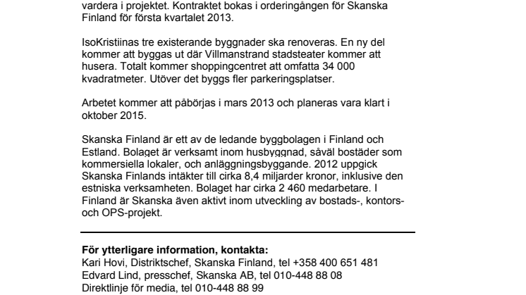 Skanska har tecknat avtal om att bygga ut och renovera IsoKristiina shoppingcenter i Villmanstrand, Finland. Kontraktet är värt EUR 88 M, cirka 754 miljoner kronor. Citycon och Ilmarinen investerar 50 procent vardera i projektet. Kontraktet bokas i orderingången för Skanska Finland för första kvartalet 2013.
