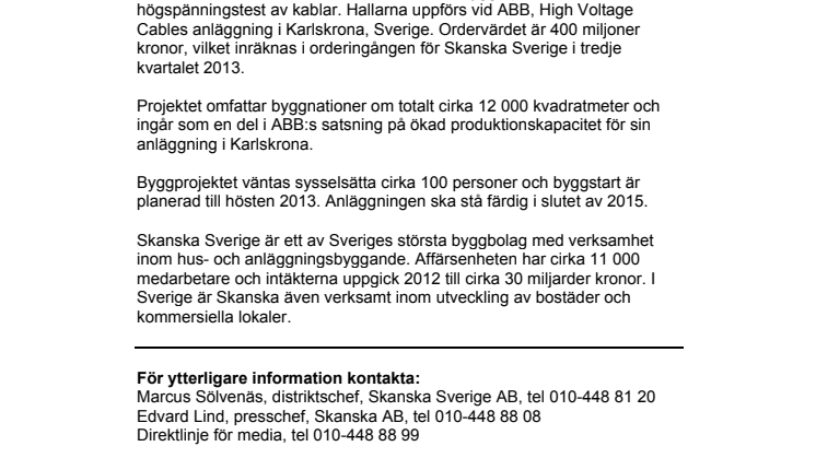 Skanska har slutit avtal med ABB AB om att bygga provhallar för högspänningstest av kablar. Hallarna uppförs vid ABB, High Voltage Cables anläggning i Karlskrona, Sverige. Ordervärdet är 400 miljoner kronor, vilket inräknas i orderingången för Skanska Sverige i tredje kvartalet 2013.