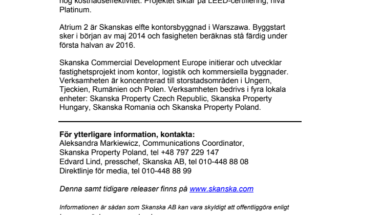 Skanska investerar EUR 58 M, cirka 510 miljoner i kontorsfastigheten Atrium 2, som kommer att ligga bredvid Atrium 1, i centrala Warszawa, Polen. Den 15 våningar höga byggnaden kommer att ha en uthyrningsbar yta om totalt cirka 20 000 kvadratmeter. Moderna gröna lösningar ska skapa en optimal inomhusmiljö i kombination med en hög kostnadseffektivitet. Projektet siktar på LEED-certifiering, nivå Platinum.