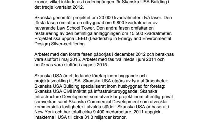 Skanska genomför projektet om 20 000 kvadratmeter i två faser. Den första fasen omfattar en utbyggnad om 9 800 kvadratmeter av nuvarande Law School Tower. Den andra fasen omfattar en restaurering av den befintliga anläggningen om 15 500 kvadratmeter. Projektet ska uppnå LEED (Leadership in Energy and Environmental Design) Silver-certifiering.
