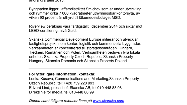 Skanska Property Czech Republic säljer sitt kontorsprojekt Riverview i Prag, Tjeckien, till en fond som förvaltas av det globala investeringsbolaget Invesco Real Estate. Värdet av transaktionen uppgår till EUR 20 M, cirka 184 miljoner kronor. Försäljningen bokförs i fjärde kvartalet 2014 och överlämnandet av fastigheten är planerat till andra kvartalet 2015.