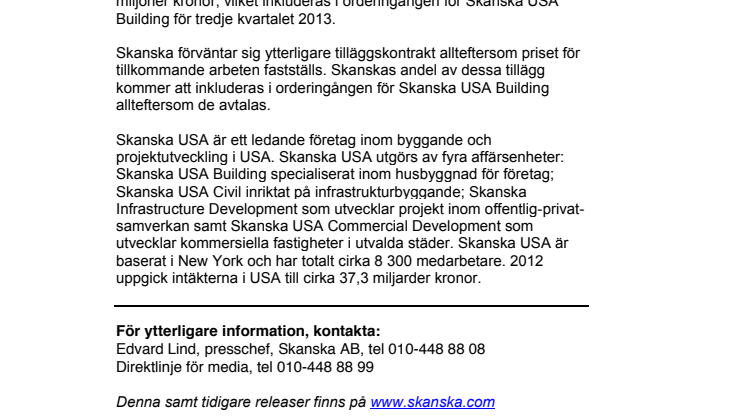 Skanska har tillsammans med en joint venture-partner fått ett tilläggskontrakt som ansvariga för bygget av en toppmodern forsknings- och utvecklingsfastighet i USA som tidigare annonserats. Skanskas andel om 50 procent uppgår till USD 120 M, cirka 780 miljoner kronor, vilket inkluderas i orderingången för Skanska USA Building för tredje kvartalet 2013.