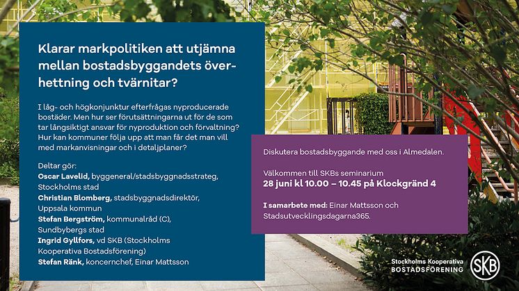 Seminariet ”Klarar markpolitiken att utjämna mellan bostadsbyggandets överhettning och tvärnitar?” arrangeras av SKB, i samarbete med Einar Mattsson och Stadsutvecklingsdagarna365.