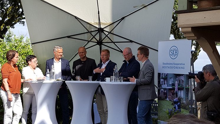 Maxa markpriset eller bygga hållbara städer? Moderator Sharon Jåma, Eva Nordström vd SKB, Anders Svensson vd HSB Stockholm, Marcus Svensson vd ByggVesta Development, Leif Gripestam, kommunstyrelsens ordförande (m) Täby kommun, Mats Gerdau, kommunstyrelsens ordförande (m) Nacka kommun, Oscar Lavelid, borgarrådssekreterare (s) Stockholm stad.