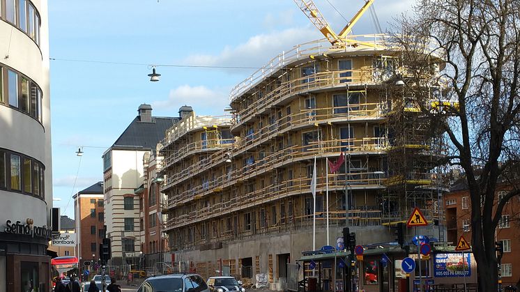 I mitten av maj beräknas hela byggnaden vara rest och då tar de invändiga arbetena vid. Murningen av den ljusa tegelfasaden inleds i juni. Bottenvåningen kläs med ett glaserat tegel.