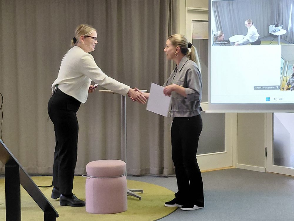 Kommunalråd Evelina Fahlesson delade ut stipendier till samtliga stipendiater och här får Camilla Holmgren, Umeå universitet, ta emot sitt och berätta om projektet ”Psykiatrisk tvångsvård för vuxna personer med anorexia nervosa”.
