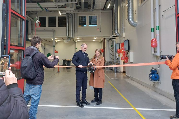 Mattias Hagelin, räddningschef, och Sara Keisu Lundh, ordförande i samhällsbyggnadsnämnden, inviger brandstationen.
