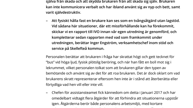 –Att fysiskt hålla fast en brukare kan ses som en tvångsåtgärd utan lagstöd. Vid sådana här situationer, där ett missförhållande kan ha förekommit, skickar vi en rapport till IVO innan vår egen utredning är genomförd, och kompletterar sedan rapporten med vad som framkommit under utredningen, berättar Inger Engström, verksamhetschef inom stöd och service på Skellefteå kommun.