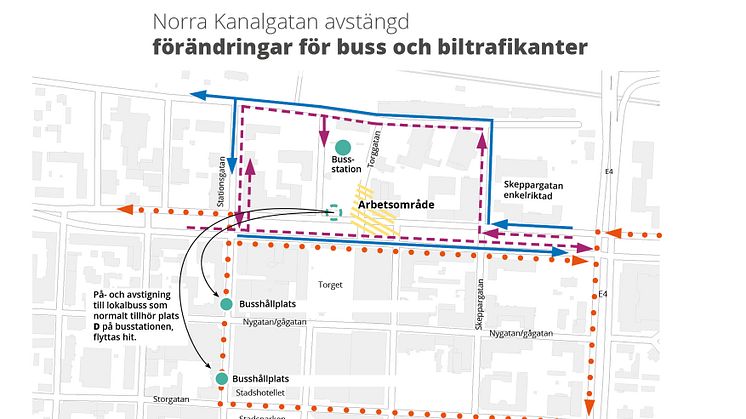 Kanalgatans norra körfält kommer att vara avstängt vid busstorget 3-21 april. Bilister och regionalbussar kommer att omdirigeras och hänvisas via Skeppargatan vidare upp till Södra Järnvägsgatan. Skeppargatan kommer då att vara enkelriktad från söder till norr. Detta påverkar inte Länstrafiken Västerbottens hållplatser. Däremot blir det förändringar för Skellefteå buss resenärer.