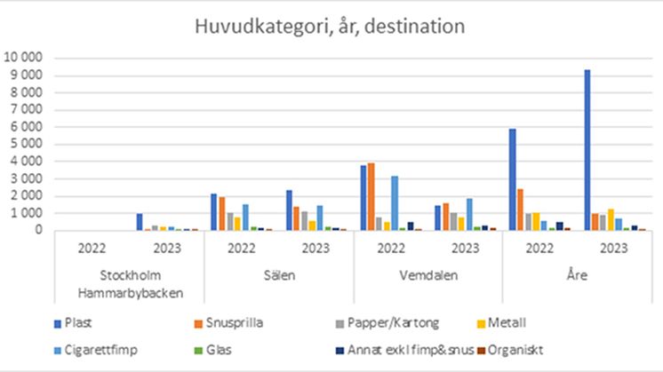 Undersökningen visar att de vanligast förekommande skräpet som plockades upp var framförallt återigen plastskräp av olika slag även om andelen papper/kartong också ökar, tätt följt av cigarettfimpar och snusprillor (som dock minskat något i år). Skräpet hittades i närheten av boenden, liftar och restauranger.