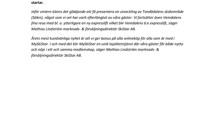 – Inför vintern känns det glädjande att få presentera en utveckling av Tandådalens skidområde (Sälen), något som vi vet har varit efterlängtat av våra gäster. Vi fortsätter även Vemdalens fina resa med bl. a. ytterligare en ny expresslift vilket blir Vemdalens 6:e expresslift, säger Mathias Lindström marknads- & försäljningsdirektör SkiStar AB.
