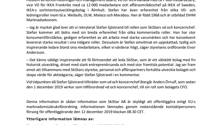 – Jag är mycket glad över att vi rekryterat Stefan Sjöstrand till rollen som SkiStars vd och koncernchef. Stefan kommer att bidra med sin breda erfarenhet från olika kommersiella roller. Han har stor konsumentförståelse, gedigen erfarenhet av att arbeta med starka varumärken och har konsekvent levererat starka resultat i sina tidigare roller. Dessutom är Stefan omvittnat en uppskattad, tydlig och inspirerande ledare bland sina medarbetare, vilket vi värderar högt, säger styrelsens ordförande Eivor Andersson.