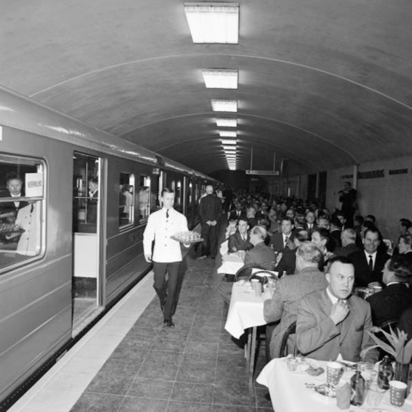 Firande vid Östermalmstorg av förlängningen av tunnelbanan till Sätra år 1965.