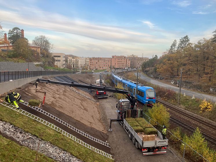 Utsikt från Ruddammsvägen vid Roslagsbanan där grön banvall anläggs i en bakslänt till Roslagsbanan.jpg