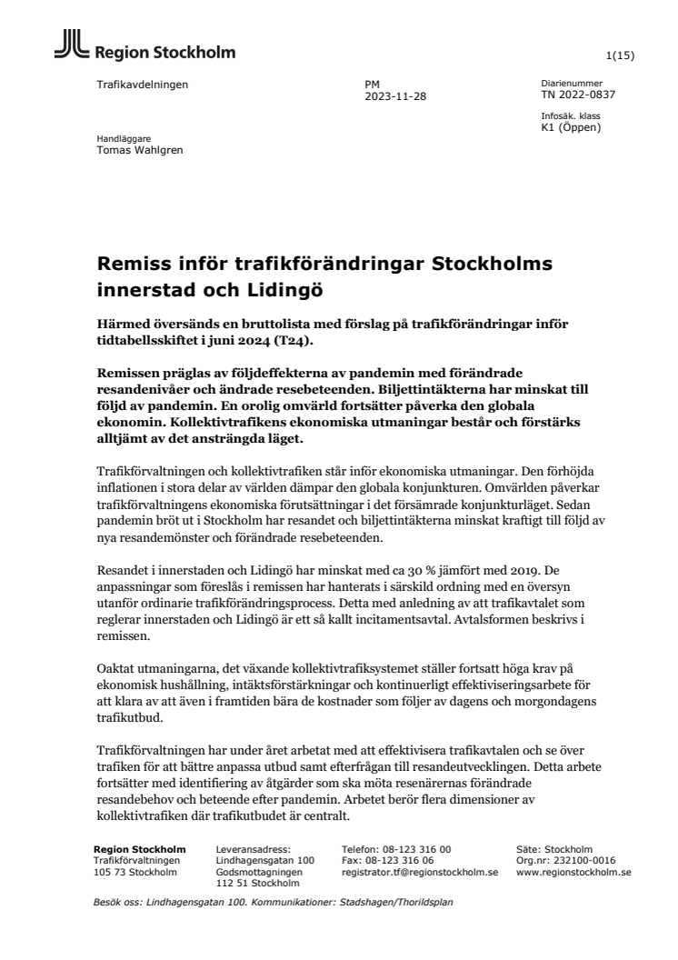 Idag har trafikförvaltningen överlämnat en bruttolista med förslag på förändringar i busstrafiken i Stockholms innerstad och Lidingö. Förslagen innebär ändrade linjedragningar, förändrad turtäthet och några helt indragna linjer. De föreslagna justeringarna kan träda i kraft vid tidtabellsskiftet vid midsommar 2024.