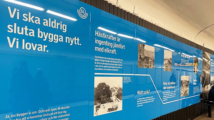 Den som åker Gröna linjen till och från Fridhemsplan kan läsa om kollektivtrafikens historia på en 22 meter lång blå SL-vägg vid det södergående spåret.