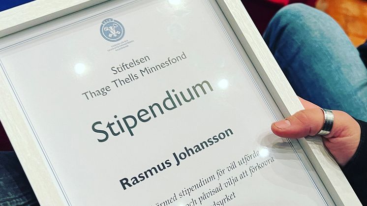 Lagom till att det gått ett par år sedan Rasmus Johansson sadlade om till säkerhetstekniker tilldelas han ett stipendium i Thage Thells Minnesfond. Pengarna ska han använda för att utveckla sig inom yrket, i första hand för att genomföra preparandkursen - en förutsättning för gesällbrevet.