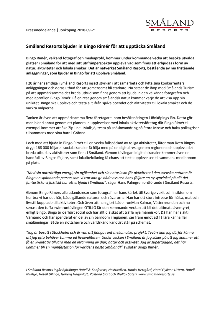 Bingo Rimér, välkänd fotograf och mediaprofil, kommer under kommande vecka att besöka utvalda platser i Småland för att med sitt utifrånperspektiv uppleva vad som finns att erbjudas i form av natur, aktiviteter och lokala smaker. Det är nätverket Småland Resorts, bestående av nio fristående anläggningar, som bjuder in Bingo för att uppleva Småland.