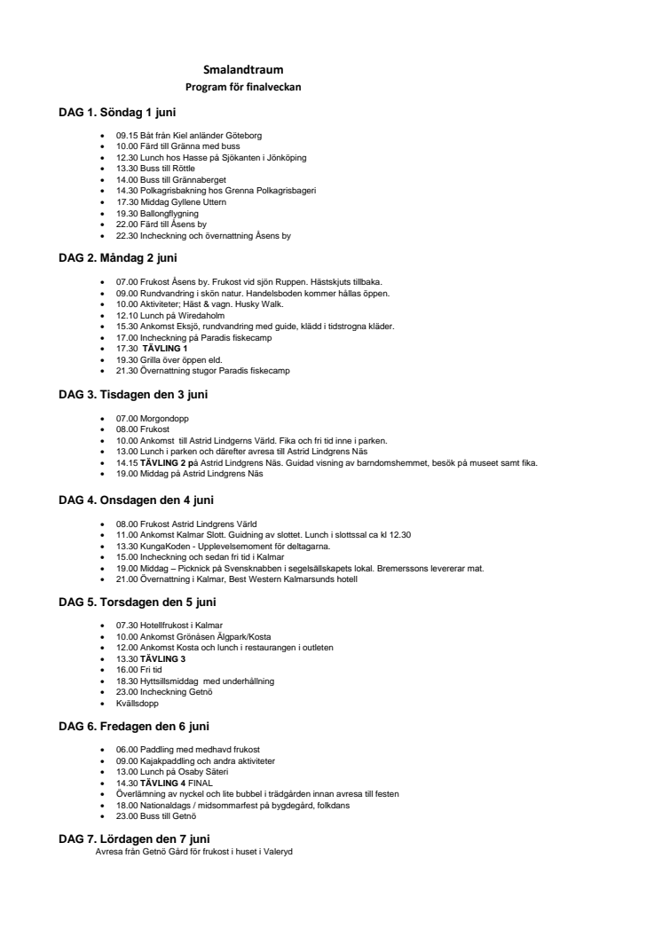 Under första veckan i juni kommer 5 tyska familjer att göra upp om vem som vinner ett falurött sommartorp från år 1900. Under hösten och vintern har det pågått en kunskapstävling i olika etapper och nu är det dags för finalomgången som avgörs på olika nedslagsplatser i Småland. Syftet med tävlingen är att marknadsföra Småland som turistdestination. Hela finalveckan TV-sänds via webben i juni.