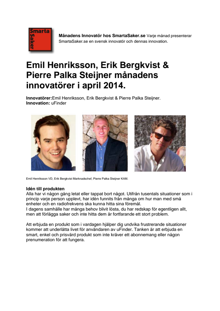 Emil Henriksson, Erik Bergkvist & Pierre Palka Steijner månadens innovatörer i april 2014.