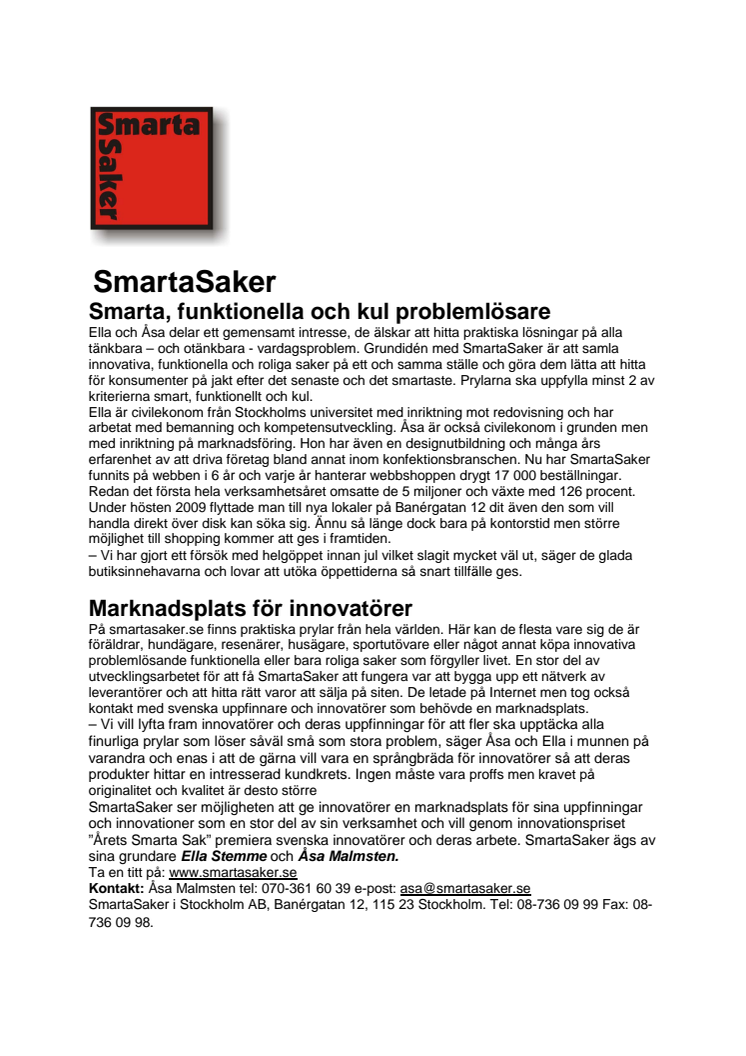 Ella och Åsa delar ett gemensamt intresse, de älskar att hitta praktiska lösningar på alla tänkbara – och otänkbara - vardagsproblem. Grundidén med SmartaSaker är att samla innovativa, funktionella och roliga saker på ett och samma ställe och göra dem lätta att hitta för konsumenter på jakt efter det senaste och det smartaste. Prylarna ska uppfylla kriterierna smart, funktionellt och kul.