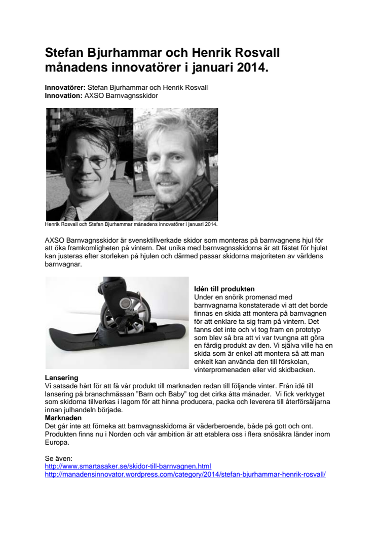 Stefan Bjurhammar och Henrik Rosvall är männen bakom AXSO Barnvagnsskidor, svensktillverkade skidor som monteras på barnvagnens hjul för att öka framkomligheten på i snö.