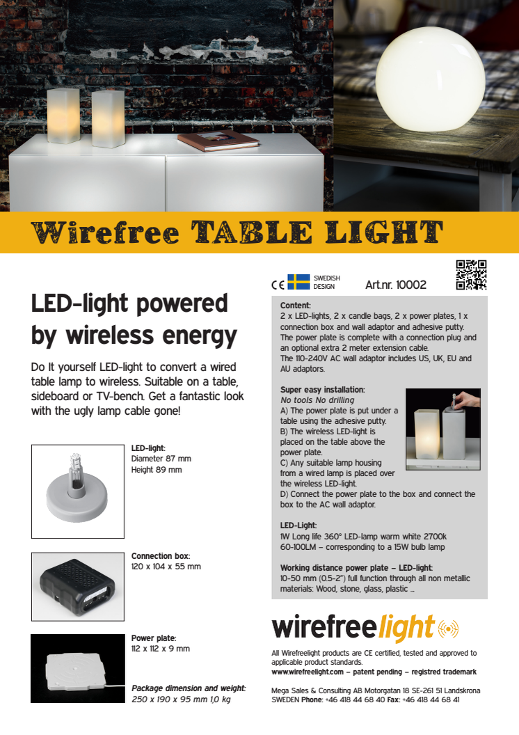 Wirefreelight - Trådlös el bordsbelysningskit. Produktblad.