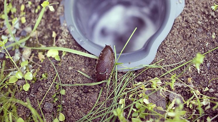 en liten grop i gräsmattan, sänk ned snigelfällan, fyll på med öl och