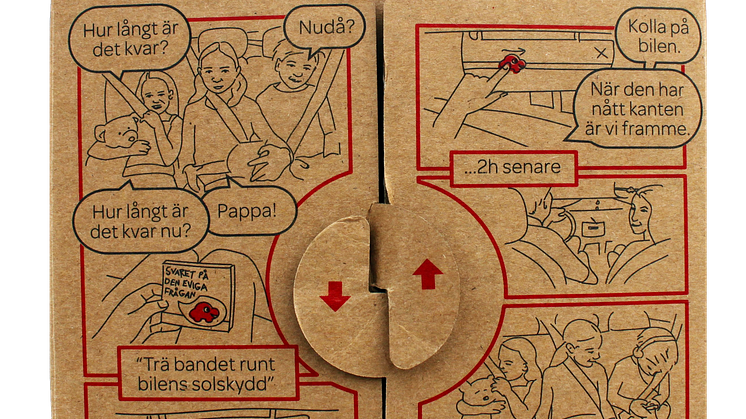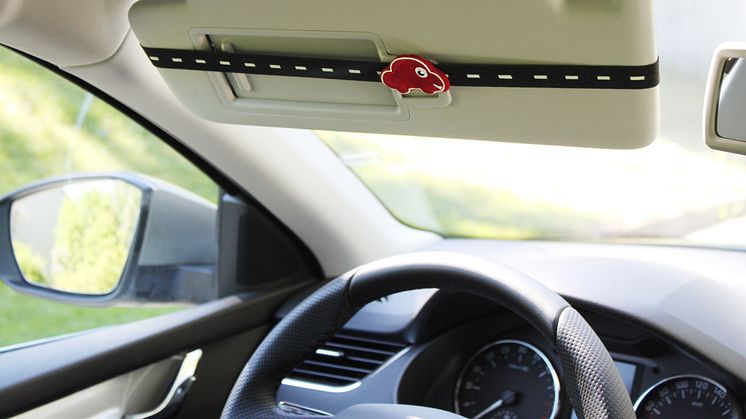 Resvägsvisaren "Hur långt är det kvar?" fästs på bilens solskydd med ett elastiskt band i form av en bilväg. När barnen frågar hur långt det är kvar flyttar föräldern tygbilen längs bilvägen och visar hur man åkt och sträckan som är kvar.