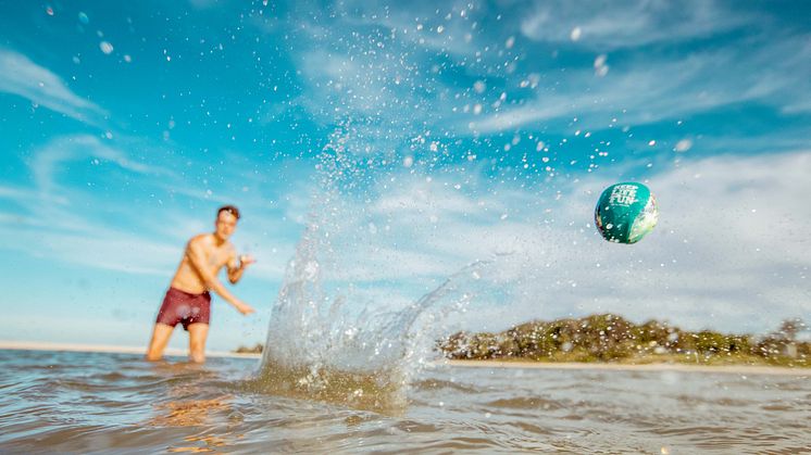 Bollen har en unik gelkärna med ett yttre av ett fint mönstrat tyg som snabbt torkar i solen. Vattenstudsbollen är anpassad för att användas i vattnet, så undvik att kasta den mot marken eller klippor.