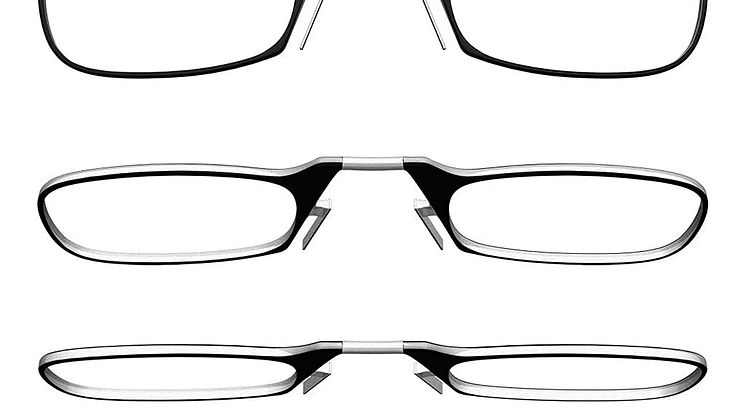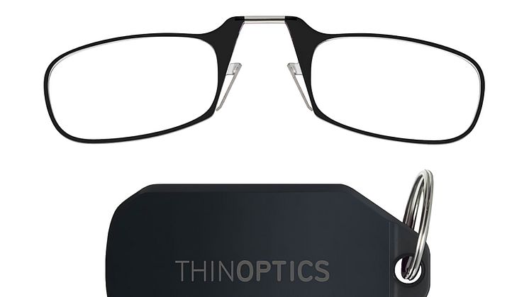 De hopfällbara läsglasögon från ThinOptics kan du alltid ha nära till hands, var du än är. De små skalmlösa läsglasögonen kan vikas ihop och förvaras i ett tunt fodral med nyckelring. Fodralet är enbart 1 cm tjockt, kan fästas på nyckelknippan och får enkelt plats i jeansfickan.