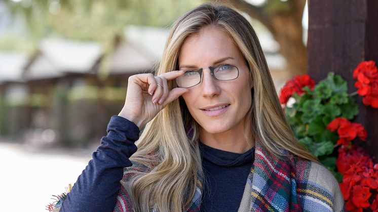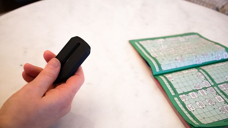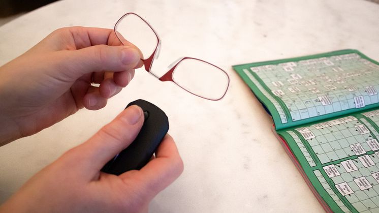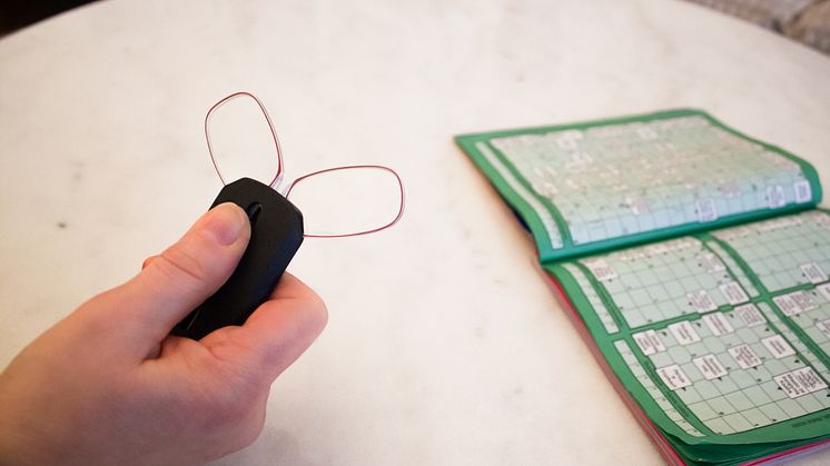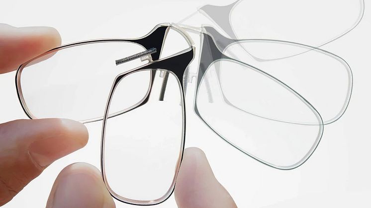 Läsglasögonen fälls enkelt ut ur fodralet genom att dra upp ett reglage med tummen. Glasögonen vecklas automatiskt upp, redo att placeras på näsan.