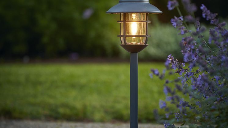 Vacker gångbelysning med solcellsladdning som tänds automatiskt i skymningen och lyser upp med ett mysigt, varmvitt ljus. Den grafitgrå utelampan är helt sladdfri och det är enkelt att sticka ned den i gräsmattan eller i rabatten.