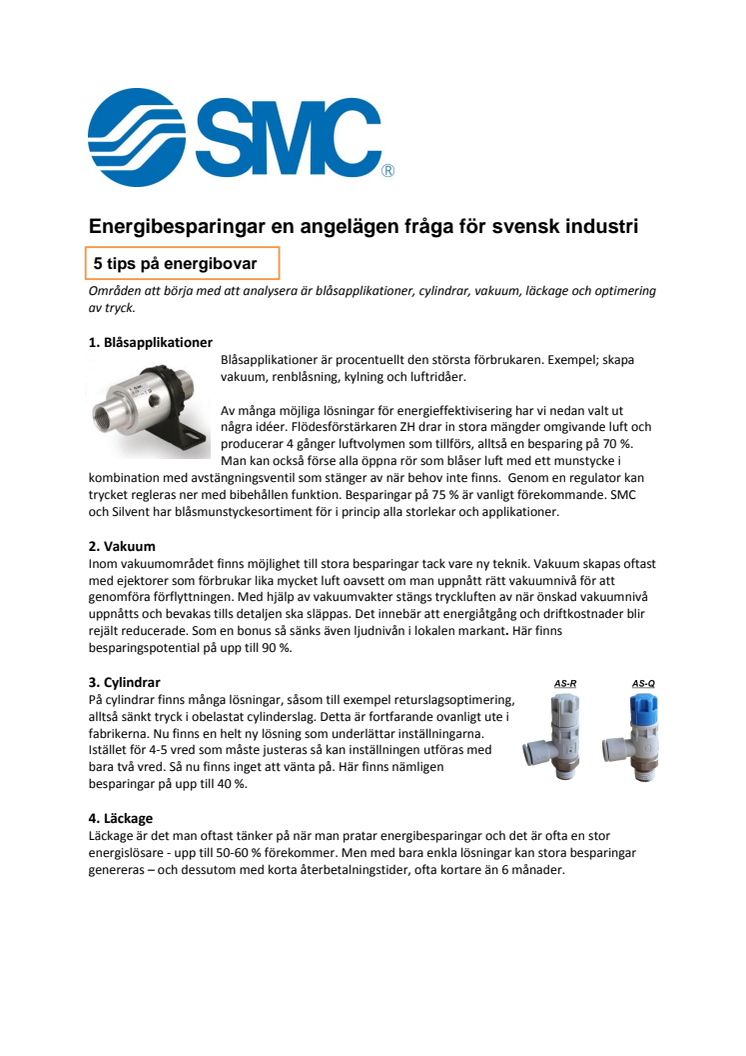 I tryckluftssystemet finns det några delar att ta hänsyn till; produktion, distribution och förbrukare i fabriken. Där kompressortillverkarna står för kunnandet på produktion och distribution av tryckluft och vilka effektiviseringsmöjligheter dessa har. SMC fokuserar på användningen av tryckluft