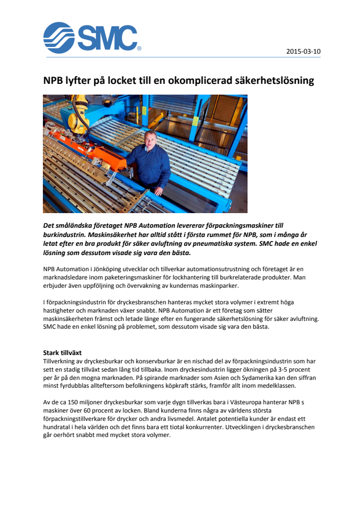 Det småländska företaget NPB Automation levererar förpackningsmaskiner till burkindustrin. Maskinsäkerhet har alltid stått i första rummet för NPB, som i många år letat efter en bra produkt för säker avluftning av pneumatiska system. SMC hade en enkel lösning som dessutom visade sig vara den bästa.
