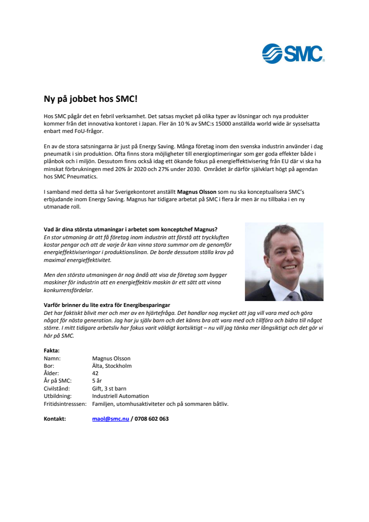 Hos SMC pågår det en febril verksamhet. Det satsas mycket på olika typer av lösningar och nya produkter kommer från det innovativa kontoret i Japan. Fler än 10 % av SMC:s 15000 anställda world wide är sysselsatta enbart med FoU-frågor. En av de stora satsningarna är just på Energy Saving och därför har nu SMC anställt Magnus Olsson som konceptchef.