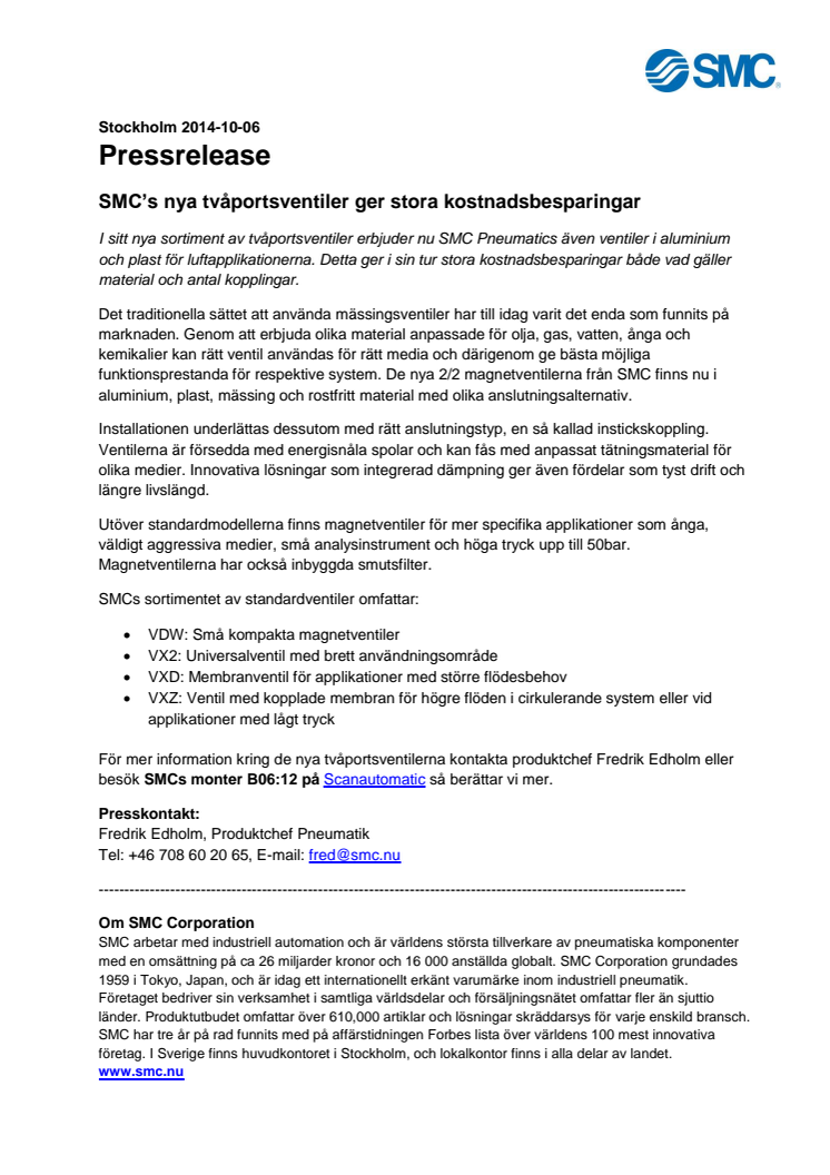 SMC’s nya tvåportsventiler ger stora kostnadsbesparingar