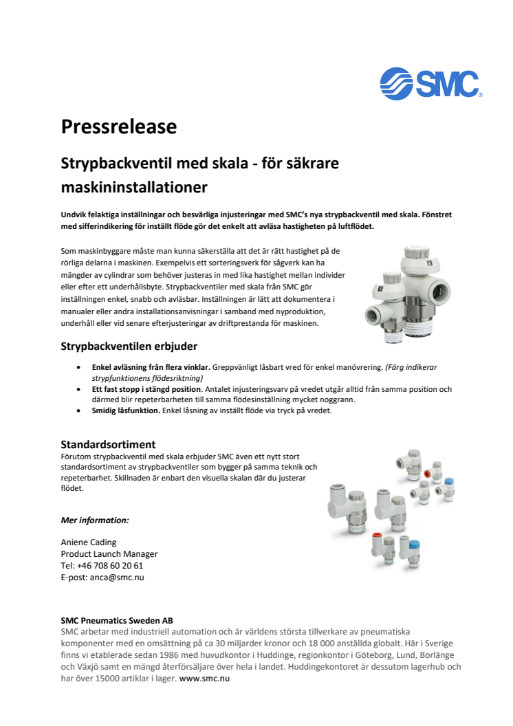Undvik felaktiga inställningar och besvärliga injusteringar med SMC’s nya strypbackventil med skala. Fönstret med sifferindikering för inställt flöde gör det enkelt att avläsa hastigheten på luftflödet.