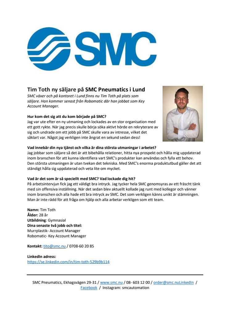 SMC växer och på kontoret i Lund finns nu Tim Toth på plats som säljare. Han kommer senast från Robomatic där han jobbat som Key Account Manager.