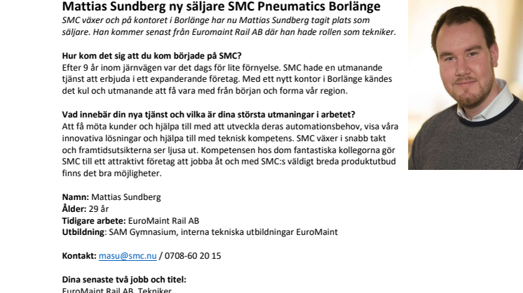 SMC växer och på kontoret i Borlänge har nu Mattias Sundberg tagit plats som säljare. Han kommer senast från Euromaint Rail AB där han hade rollen som tekniker.