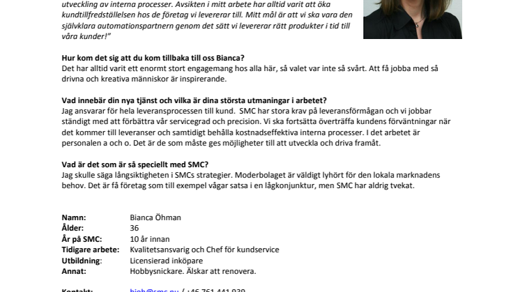 En nygammal bekant dyker upp på SMC. Bianca Öhman har varit hos oss på SMC förut men är nu tillbaka på en ny position som Operations Manager. Bianca har under en lång tid varit verksam inom industrin där hon började sin karriär på Eriksson för att sedan arbeta hos två olika automationsföretag. Genom hennes verksamma år på SMC har hon varit kvalitetsansvarig och chef för kundservice och nu kliver hon in i en företagsledande roll. ”Under många år arbetade jag med inköp och logistik för att sedan inrikta mig på utveckling av interna processer. Avsikten i mitt arbete har alltid varit att öka kundtillfredställelsen hos de företag vi levererar till. Mitt mål är att vi ska vara den självklara automationspartnern genom det sätt vi levererar rätt produkter i tid till våra kunder!”
