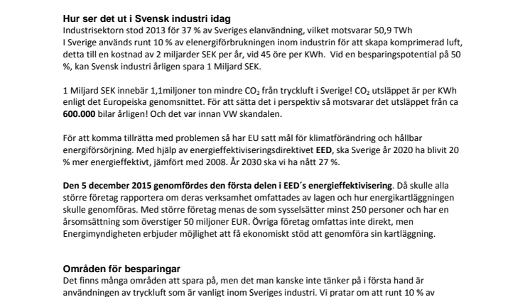 Industrisektorn stod 2013 för 37 % av Sveriges elanvändning, vilket motsvarar 50,9 TWh. I Sverige används runt 10 % av elenergiförbrukningen inom industrin för att skapa komprimerad luft, detta till en kostnad av 2 miljarder SEK per år, vid 45 öre per KWh. Vid en besparingspotential på 50 %, kan Svensk industri årligen spara 1 Miljard SEK.