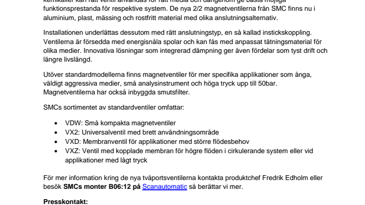 För mer information kring de nya tvåportsventilerna kontakta produktchef Fredrik Edholm eller besök SMCs monter B06:12 på Scanautomatic så berättar vi mer.