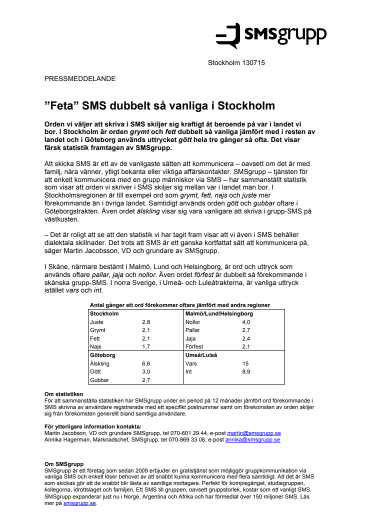 Orden vi väljer att skriva i SMS skiljer sig kraftigt åt beroende på var i landet vi bor. I Stockholm är orden "grymt" och "fett" dubbelt så vanliga jämfört med i resten av landet och i Göteborg används uttrycket "gött" hela tre gånger så ofta. Det visar färsk statistik framtagen av SMSgrupp.