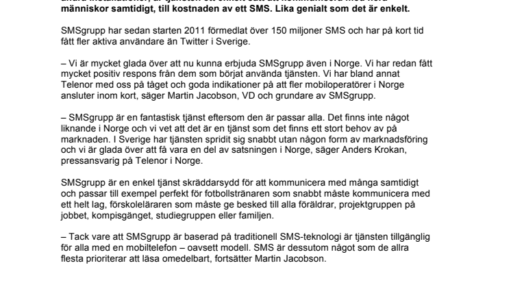 – SMSgrupp är en fantastisk tjänst eftersom den är passar alla. Det finns inte något liknande i Norge och vi vet att det är en tjänst som det finns ett stort behov av på marknaden. I Sverige har tjänsten spridit sig snabbt utan någon form av marknadsföring och vi är glada över att få vara en del av satsningen i Norge, säger Anders Krokan, pressansvarig på Telenor i Norge.