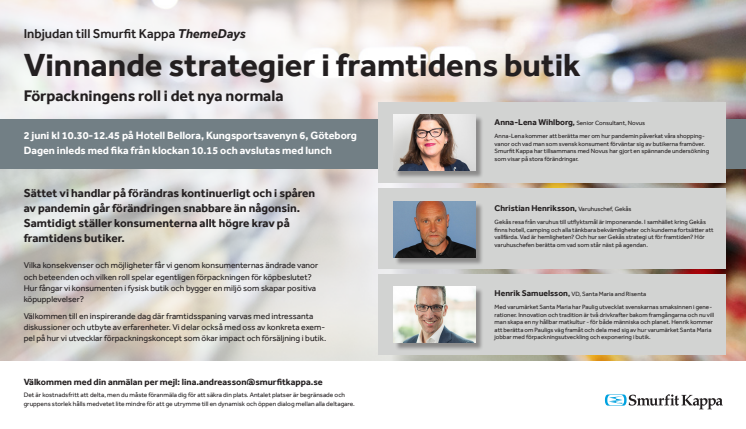 Sättet vi handlar på förändras kontinuerligt och i spåren av pandemin går förändringen snabbare än någonsin. Samtidigt ställer konsumenterna allt högre krav på framtidens butiker. Vilka konsekvenser och möjligheter får vi genom konsumenternas ändrade vanor och beteenden? Hur fortsätter man vara relevant för konsumenten och hur bygger man en miljö som skapar positiva köpupplevelser? Och vilken roll spelar egentligen förpackningen för själva köpbeslutet?