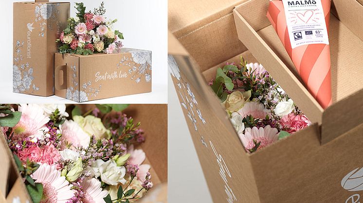 Smurfit Kappa fick även uppdraget att ta fram ett designförslag med Euroflorists logotyp, payoffen ”Sent with love” och en svartvit blomsterdekor. Kort sagt, en högst funktionell och ekonomisk lösning i lyxförpackning. Vem vill du själv överraska?