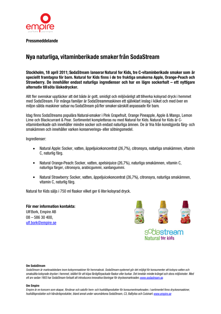 Stockholm, 18 april 2011; SodaStream lanserar Natural for Kids, tre C-vitaminberikade smaker som är speciellt framtagna för barn. Natural for Kids finns i de tre fruktiga smakerna Apple, Orange-Peach och Strawberry. De innehåller endast naturliga ingredienser och har en lägre sockerhalt – ett nyttigare alternativ till söta läskedrycker.
