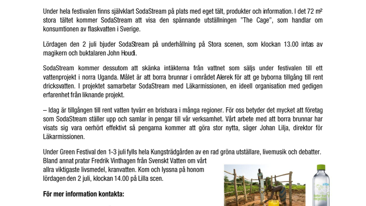 SodaStream kommer dessutom att skänka intäkterna från vattnet som säljs under festivalen till ett vattenprojekt i norra Uganda. Målet är att borra brunnar i området Alerek för att ge byborna tillgång till rent dricksvatten. I projektet samarbetar SodaStream med Läkarmissionen, en ideell organisation med gedigen erfarenhet från liknande projekt.