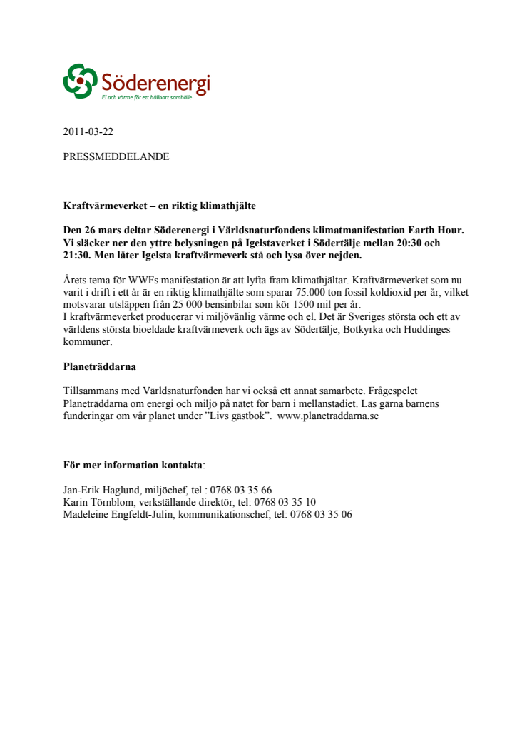 Den 26 mars deltar Söderenergi i Världsnaturfondens klimatmanifestation Earth Hour. Vi släcker ner den yttre belysningen på Igelstaverket i Södertälje mellan 20:30 och 21:30. Men låter Igelsta kraftvärmeverk stå och lysa över nejden.Årets tema för WWFs manifestation är att lyfta fram klimathjältar. Kraftvärmeverket som nu varit i drift i ett år är en riktig klimathjälte.